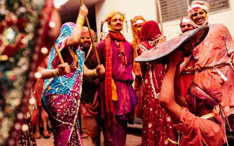 If you’re looking for the most authentic and energetic Holi experiences, head to Barsana, Vrindavan, or Mathura. Here, the festivities stretch over nearly 10 days, starting a week before the main event. One of the most captivating traditions is Lathmar Holi, or “the Holi of Sticks”, celebrated around 6–7 days before Holi, where women playfully hit men with sticks while everyone cheers and laughs in good spirit.