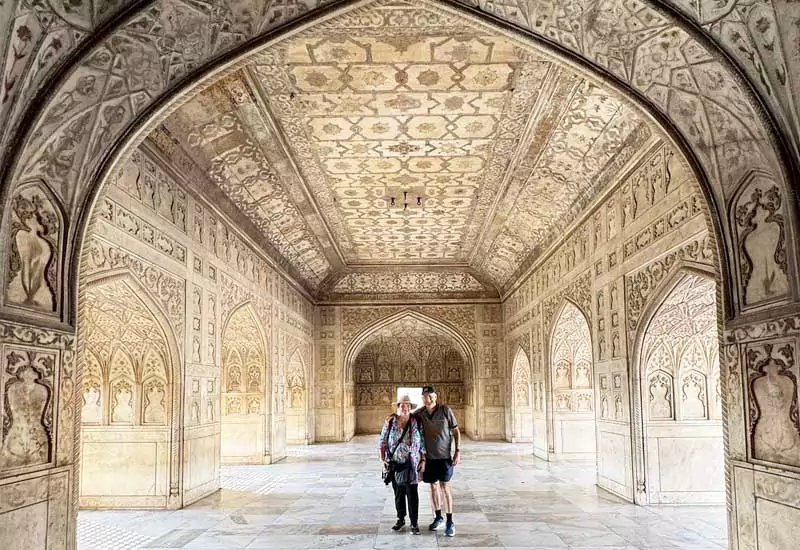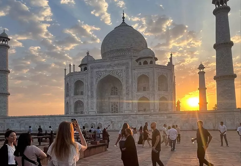 After exploring the Taj Mahal, the journey continues to the Agra Fort, another UNESCO World Heritage Site. This grand red sandstone fortress was once the residence of Mughal emperors and houses impressive palaces, halls, and courtyards, along with beautiful views of the Taj Mahal from inside the fort. suggest title