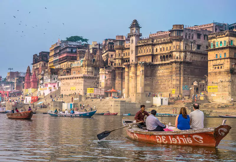 Board a traditional wooden rowboat for a sunrise boat ride along the Ganges. Watch the sun rise above the water as you float past famous ghats like Tulsi Ghat, Harishchandra Ghat, and Manikarnika Ghat. See locals performing yoga, bathing, offering prayers, and even cremation ceremonies—all happening side by side.