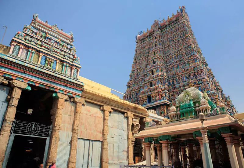 Say goodbye to Kerala’s forests as you cross into Tamil Nadu, arriving in Madurai, one of India’s oldest continuously inhabited cities. After hotel check-in and some rest, visit the architectural marvel of Meenakshi Amman Temple, with its towering gopurams and vibrant sculptures. This 2,500-year-old temple is a masterpiece of Dravidian architecture and a spiritual center. Optional excursions include the ornate Thirumalai Nayakkar Palace and the Gandhi Memorial Museum, providing insights into the Mahatma’s legacy in South India.