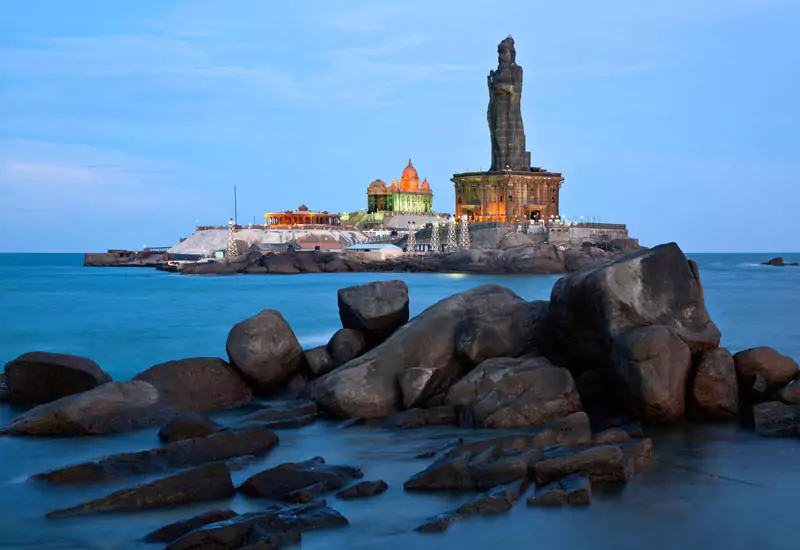 Start your day early with a scenic drive to Kanyakumari, India’s southernmost tip, where the Bay of Bengal, Arabian Sea, and Indian Ocean converge. Check in and explore the unique attractions, starting with a ferry ride to the Vivekananda Rock Memorial, built in honor of the philosopher-saint. Next, visit the Thiruvalluvar Statue, dedicated to the ancient Tamil poet. Explore the Kanyakumari Temple and end your day at Sunset Point, where the sun dips below the horizon over three water bodies—a breathtaking spectacle.