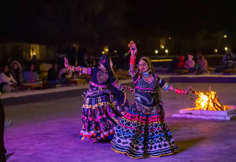 After sunset, relax at a desert camp near Sam Sand Dunes, where you will be welcomed with traditional Rajasthani hospitality. Enjoy live performances of folk music and Kalbeliya dance, followed by a delicious buffet dinner featuring authentic Rajasthani dishes. The starry desert sky adds magic to the evening, making it a perfect end to your day.